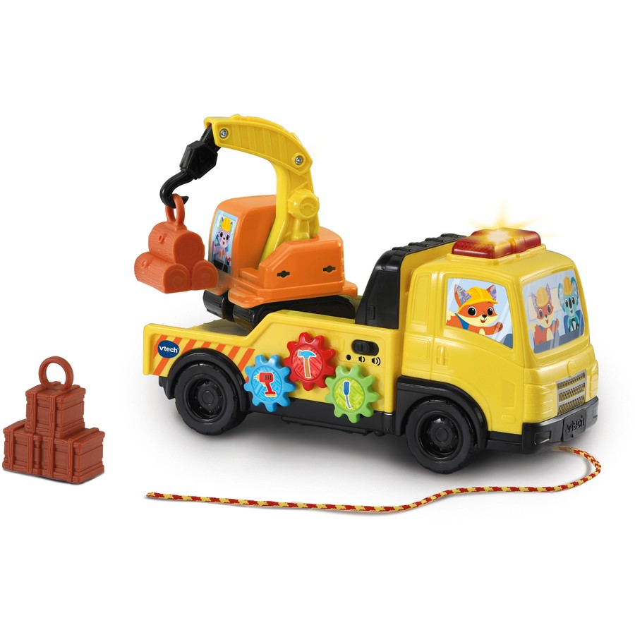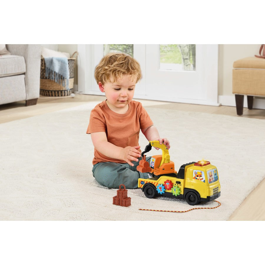 Swing into building! Have fun learning with the Building Buddies Truck. Press or spin the gear buttons to hear fun construction phrases or use the mini digger to lift and move the accessories. Get ready to build!